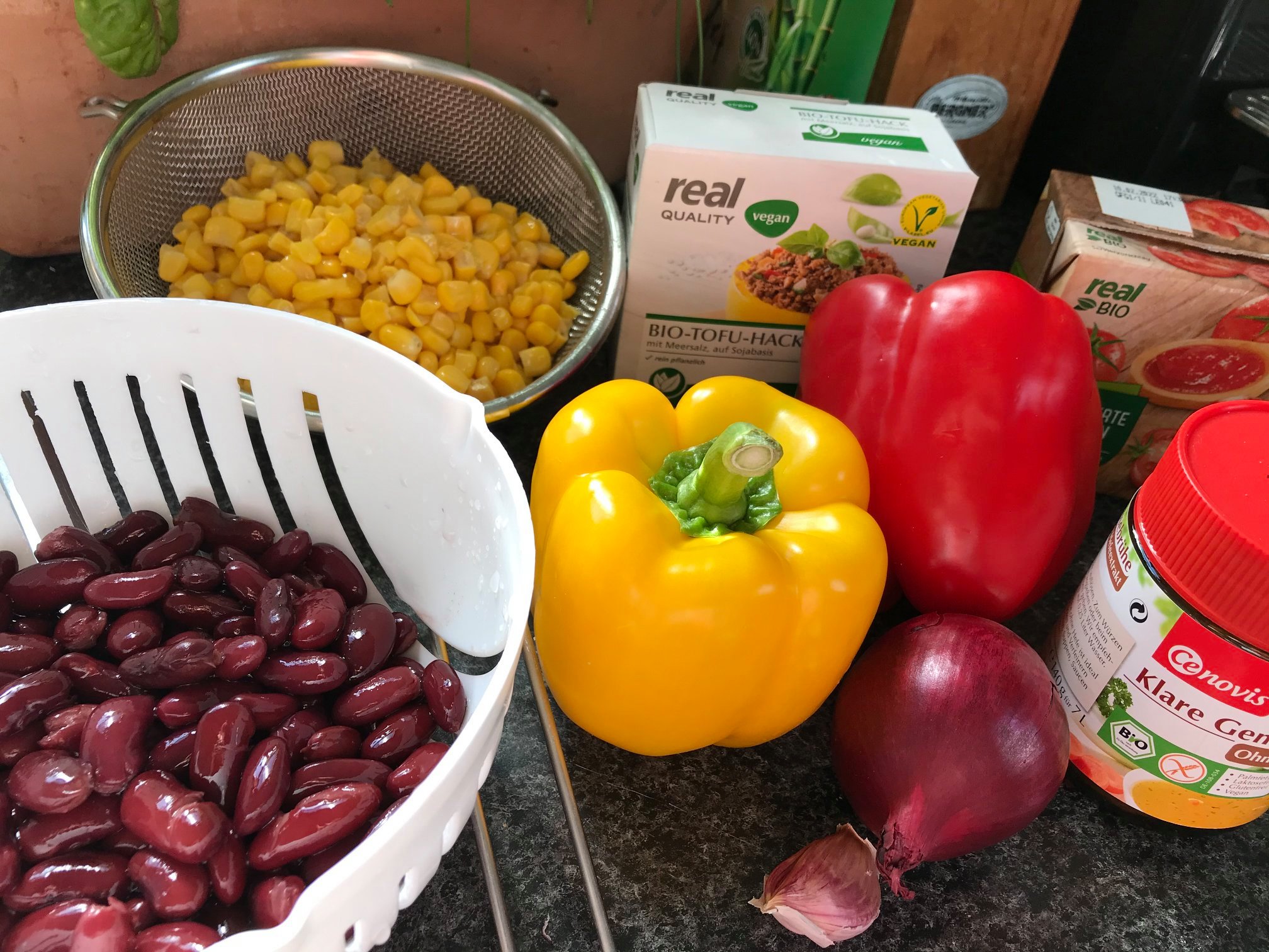 Zwiebeln und Knoblauch klein, Paprika in grobe Stücke schneiden. Kidneybohnen und Mais abgießen. Zwiebeln, Knoblauch, Tofu-Hack (Rezept schmeckt übrigens auch ohne!) und später auch die Paprika in etwas Öl anbraten. Tomatenmark dazugeben, am Boden etwas braun werden lassen und mit der Brühe ablöschen. Dazu die Tomatenstücke/Soße, die Kidneybohnen und den Mais geben. Dann mit Chili, Salz, Zucker, Paprika, Oregano und Zimt würzen. Das Ganze sollte mindestens 1,5 h köcheln auf kleiner Flamme! Gelegentlich umrühren und am Ende nochmals mit den Gewürzen abschmecken. Guten Appetit!