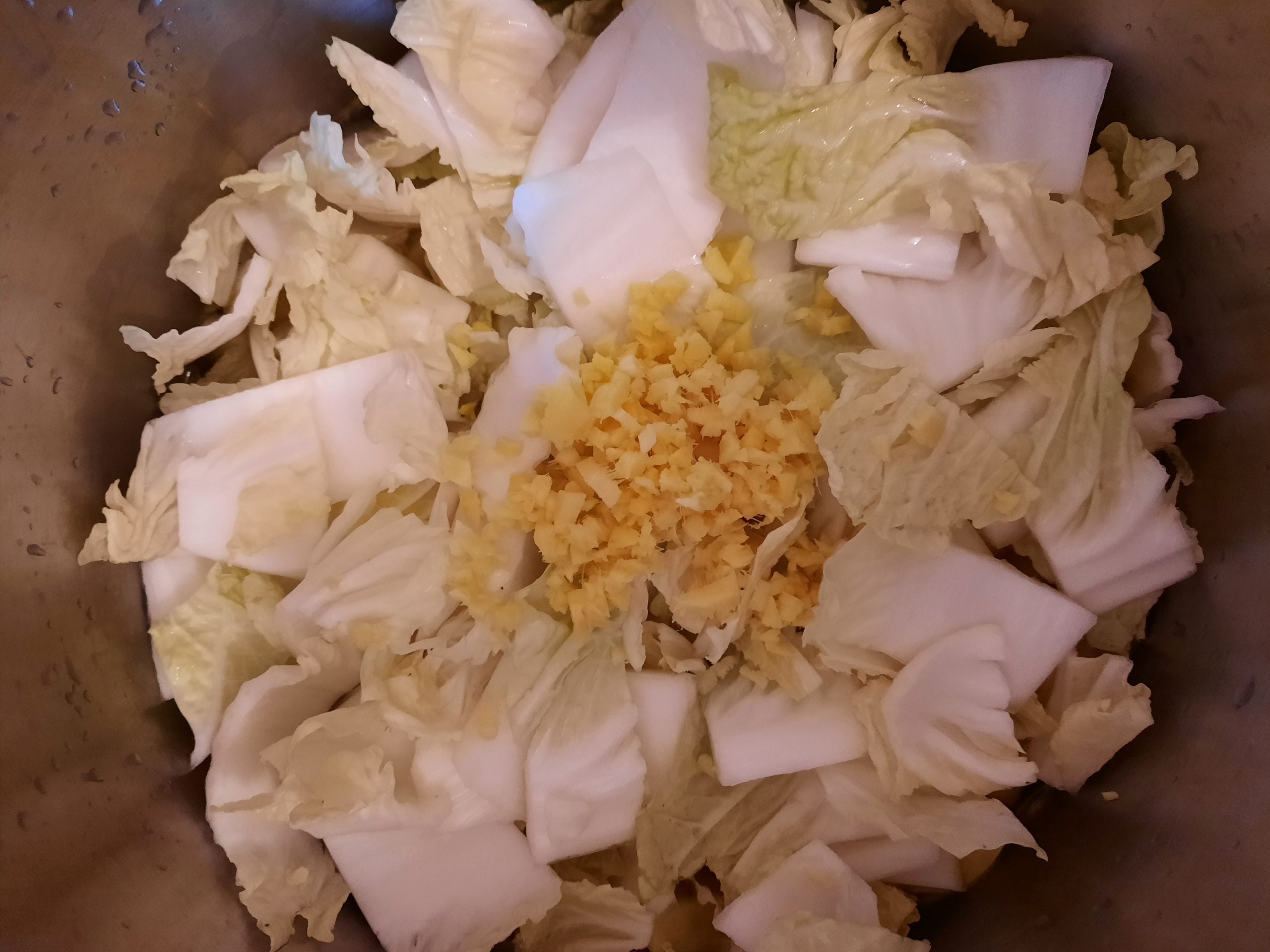 Fuß vom Chinakohl entfernen, den Kohl in ca. 1,5 cm breite Scheiben schneiden. Die unteren Scheiben, bei denen auch Strunk ist, fünfteln, waschen und zu den Kartoffeln geben. Ebenso den zerkleinerten Ingwer.