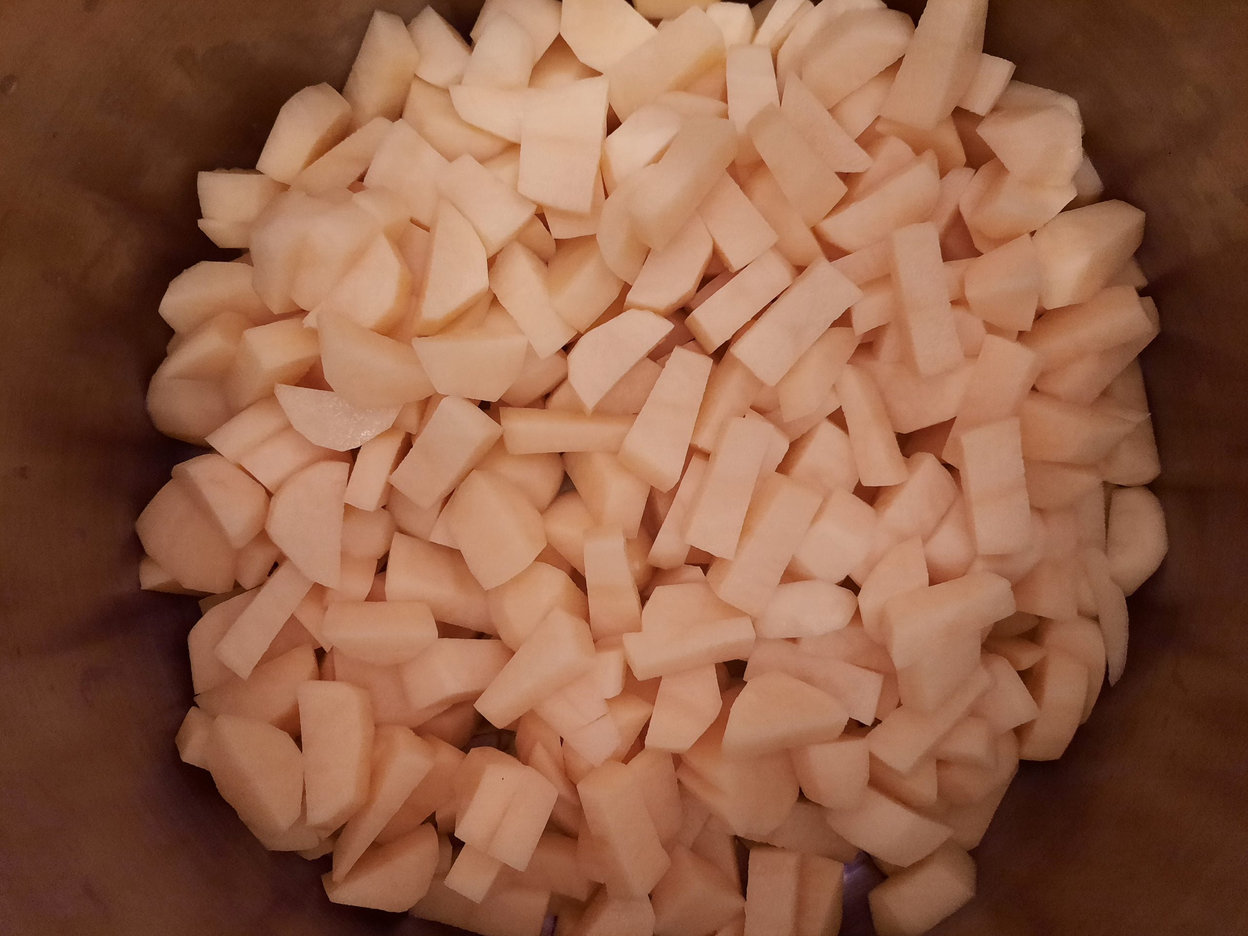 Kartoffeln schälen und in Würfel schneiden und mit einer schmackhaften eher kräftigen Gemüsebrühe gut bedecken.