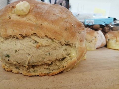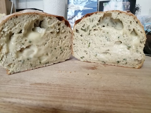 Aus allen Zutaten, außer dem Käse, einen Brotteig machen. Nach dem Aufgehen lassen auswallen. Käse wie bei einer Pizza darauf verteilen und dann wieder zusammenfalten und zum Brot formen.