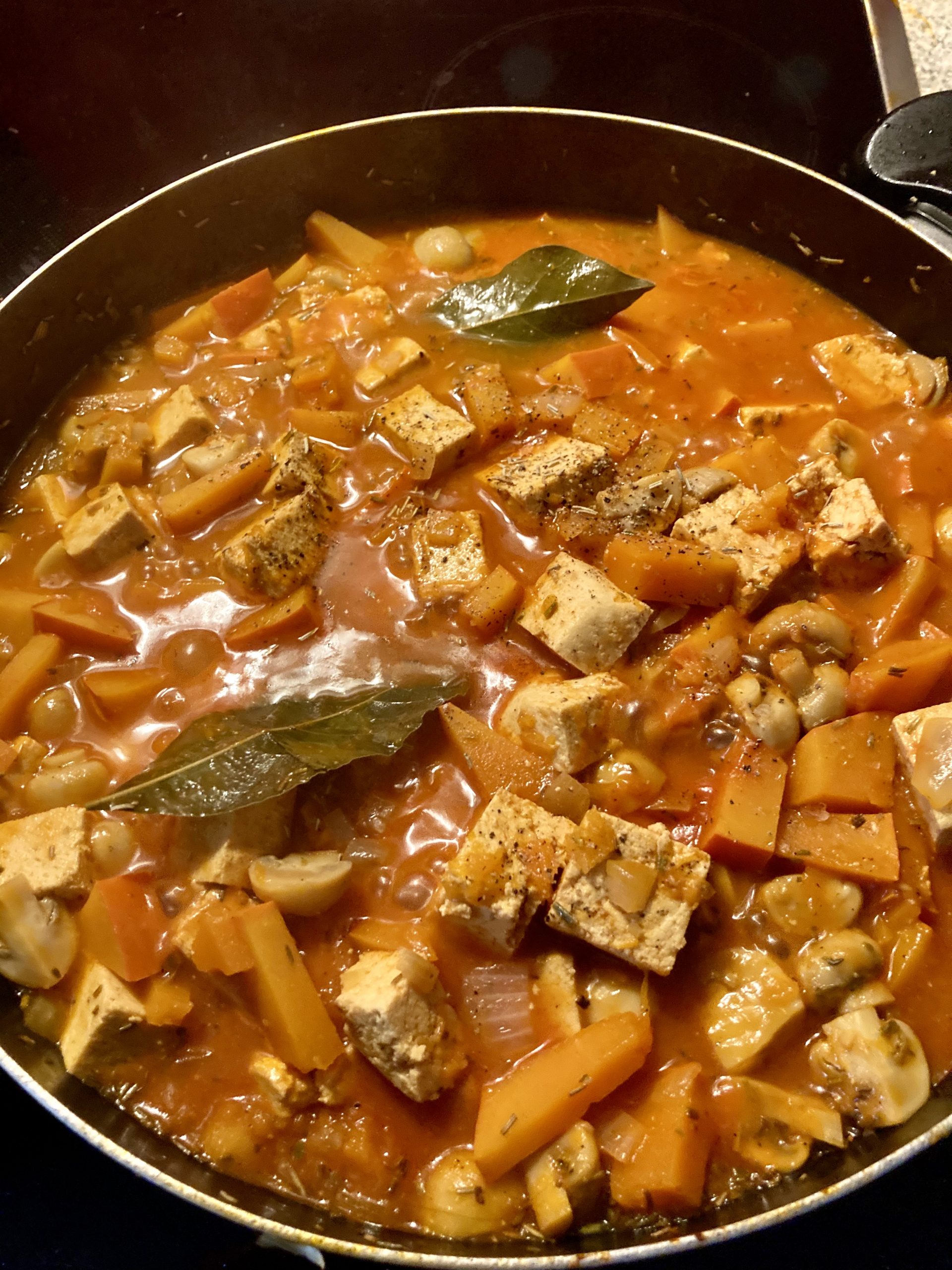 Kürbis waschen, Kerne und Fasern entfernen und würfeln. Champignons abbrausen und vierteln oder halbieren, je nach Größe. Tofu grob würfeln. Zwiebeln und Knoblauch fein würfeln und in Öl in einer tiefen Pfanne anbraten. Kürbis, Champignons und Tofu zugeben und gut vermischen. Gewürze zugeben. Ich habe von allem recht viel reingetan, aber nach Gefühl und persönlichem Geschmack. Lieber erst mal herantasten und zur Not nachwürzen. Lorbeerblätter auch zugeben. Weißwein und Brühe angießen. Flüssigkeit mit Tomatenmark andicken, bis die gewünschte Konsistenz erreicht ist. Achtung: Die Sauce dickt beim Schmoren noch ein. Ich habe nach und nach Tomatenmark untergerührt. Deckel auf die Pfanne setzen und das Gericht bei niedriger Hitze rund 25 Minuten schmoren lassen. In der Zwischenzeit Reis kochen. Reis und „Tofu au Vin“ auf Tellern anrichten und genießen. Guten Appetit! ![]()